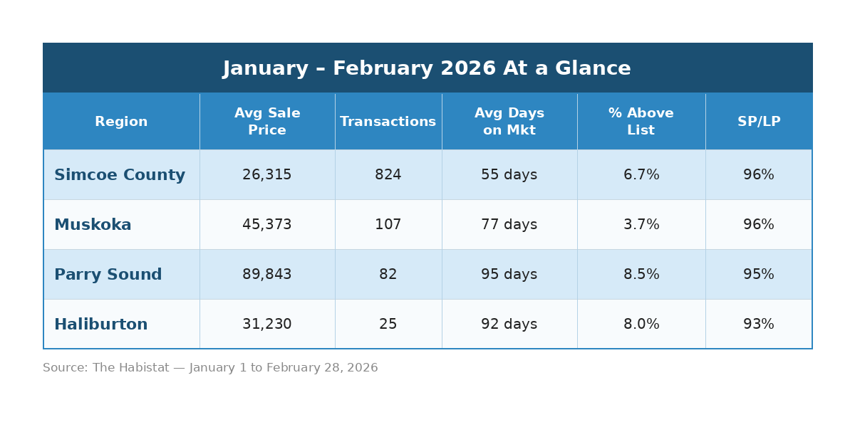 Parry Sound continues to offer exceptional value relative to its neighbours to the south, with an average sale price of $489,843 and a median of $472,500. What stands out in this market is the 8.5% above-list rate — the highest of the four regions — suggesting that well-positioned properties are generating real competition when they come to market.